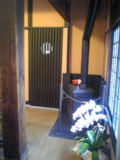 店を入って、右を見ていただきますと、薪ストーブが見えます。